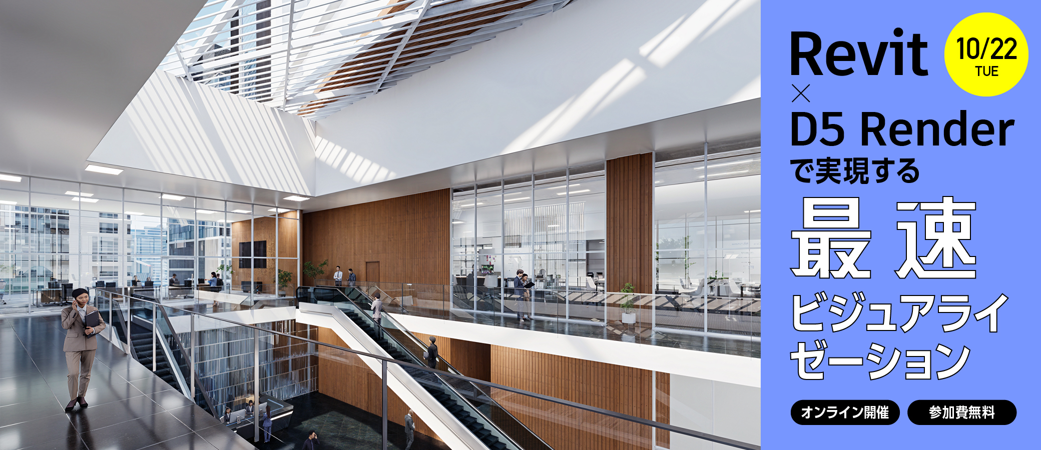 本セミナーでは、建築・インテリアデザインにおけるCGパースの制作を効率化するために、RevitとD5 Renderを活用した最速ビジュアライゼーションの実現方法をご紹介します。